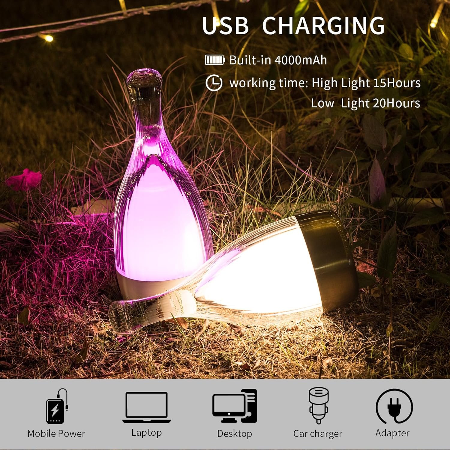 - 【4 Color Dimming】Table lamp color temperature: Warm white light,Warm light, White light(Stepless Dimming5%-100%),RGB(auto cycle RGB color),Range: 3000K-6000K and colourful; Switch the light mode by clicking, long press to control the light brightness. allows you to easily change the brightness, perfect blend of modern and chic charm, This bedside lamps suitable for outdoor camping/family gathering/dinner lighting, for you A romantic evening